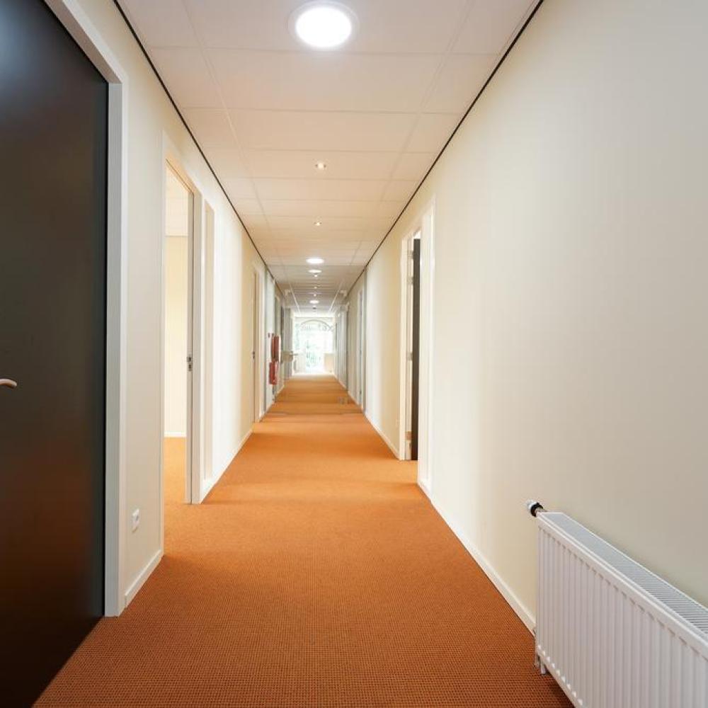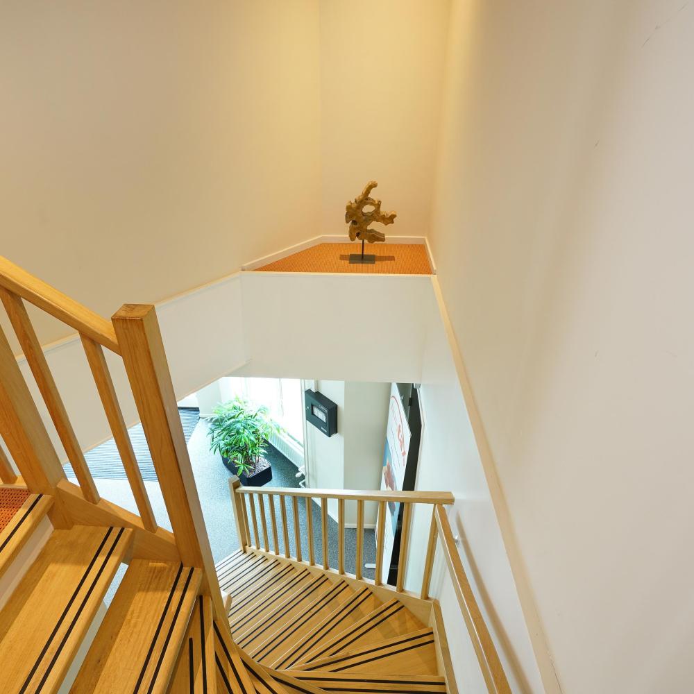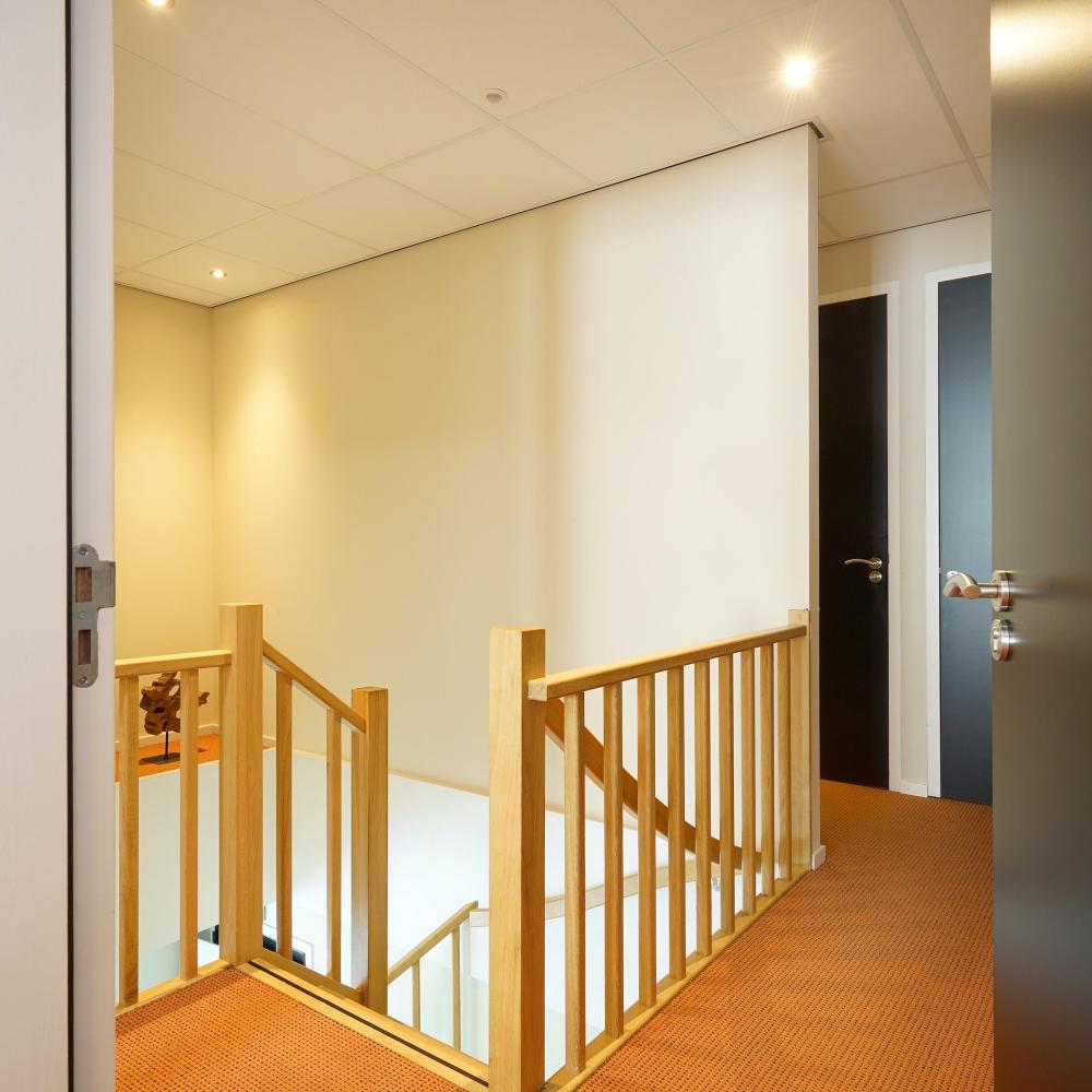 De trap geeft toegang tot de eerste verdieping. Er zijn verschillende kamers beschikbaar vanaf 21 m². Meerdere kantoorkamers huren behoort uiteraard ook tot de mogelijkheden. De totale oppervlakte van de beschikbare ruimtes betreft circa 96 m². Op de eerste verdieping is voorzien in een representatieve pantry en een dubbele toiletgroep.